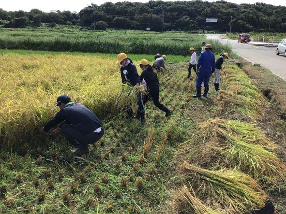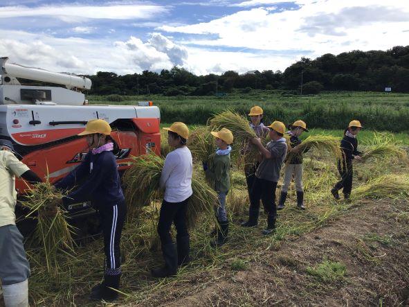 時折、爽やかな風が吹く中、5年生が稲刈りを行いました。田植えをした5月10日から約4ヶ月たち、稲穂が黄金色になっていました。子どもたちは鎌で一株一株、上手に稲を刈りました。コンバインで、刈った稲を脱穀する様子も見せていただきました。これまでお世話をしてくださったJAの方や地域の皆様、ありがとうございました。
