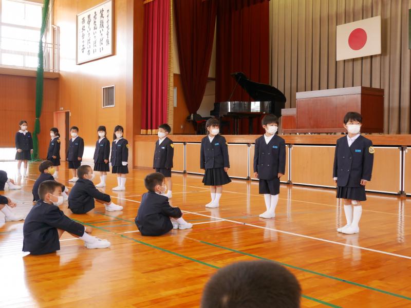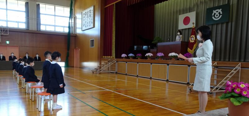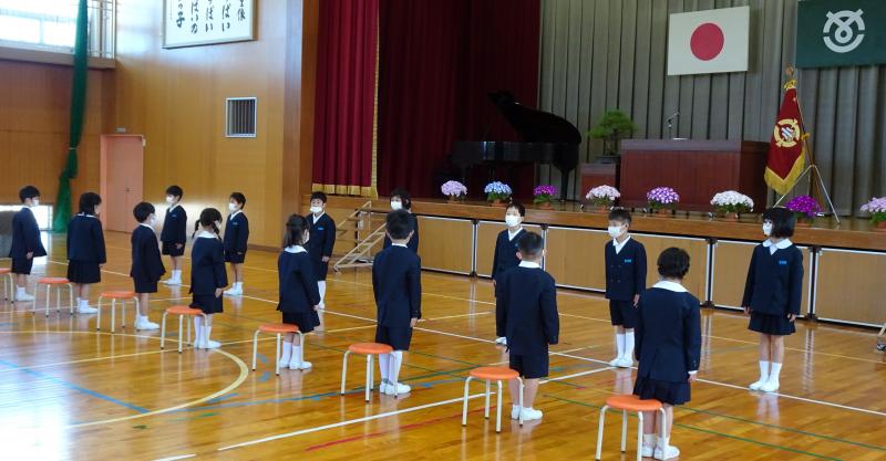 少し緊張をして保護者と一緒に登校した9名の1年生。新型コロナウィルス感染症対策のためマスク着用の入学式となりました。入学式では担任の先生の呼名に元気よく返事をして,「これからがんばるぞ。」という眼差しで壇上の校長先生を見つめてしっかりと立っていました。