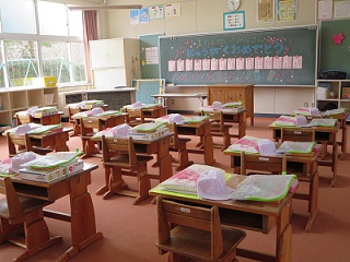 学級では進級に向けて机やいすを次の学年に移動させ,
