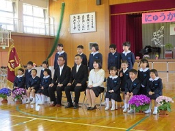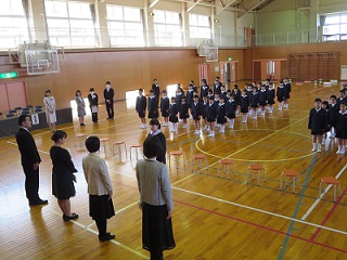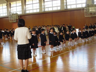 入学式では6年生に手をひかれ1年生が元気よく入場してきました。