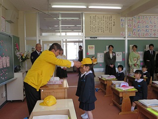入学式の後は,1年生は教室で安全協会の方から安全帽をいただき,