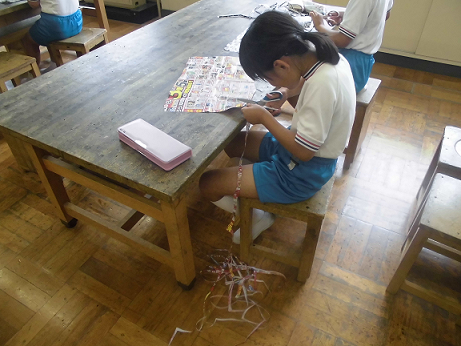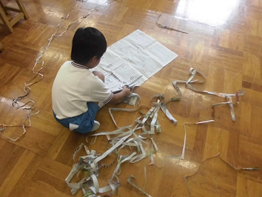 図工の時間に,新聞紙やチラシを切って長い紙を作る学習をしました。