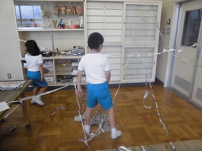 長い紙を作った後は,図工室いっぱいに紙を広げて楽しみました。