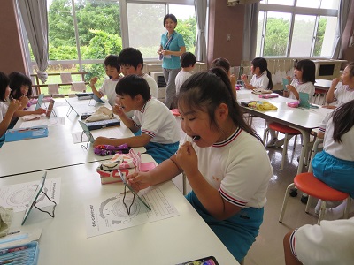 まず,プラークを染め出すための染め出し剤を歯に塗り,自分の歯にどれくらい歯垢があるかワークシートに書いて確認しました。その後,岡本先生に歯磨きのコツを習い,歯垢を落とすように一生懸命磨きました。