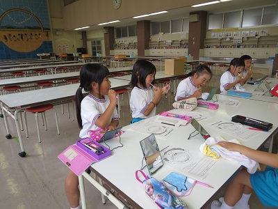 先日,養護教諭の岡本先生の指導のもと,歯の染め出し体験をしました。
