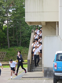 階段を走るのは危険です。降りたら小走りで集合場所へいきます。