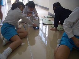 自分が作った車が、風の力でどれだけ進むか、グループのみんなと一緒に楽しく調べることができました。