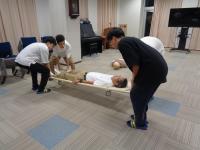 訓練後は、防災関連のビデオを視聴し、搬送(車椅子、担架)・消火訓練を行い、防災意識を高めることができました。