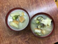 本日のメニューは、「ナスとおくら、たまねぎの野菜たっぷり味噌汁」です。