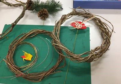 教室では、今度はお正月飾りの制作に取り掛かっています。市販のわらで作ったリースのほかに、アケビや木香バラのツルでリースを作ってみました。