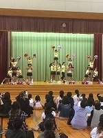 21日(金)に6年生を送る会が行われました。2年生の発表は、「 うれしなつかし!ダンスメモリー★」でした。ミニ劇の中で、 6年生が今までに楽しんできたダンスを披露しました。本番では、 6年生の反応を受けながら、2年生はとっても嬉しそうな様子で、 明るく元気よく踊ることができました。 最後の呼びかけもびしっと決めて、 本番後はやりきったという凜々しい表情をしていました。写真は、6年生へ心を込めてつくった鳥の飾りの前で撮りました!