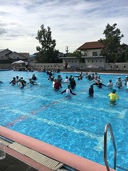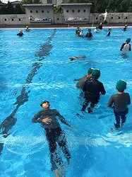 5年生はいきなり難しい課題が出ました。服を着たまま1分間浮くことができるかという課題です。さてどうなったでしょう。なんと3人の子供が1分間浮き続けることができました。コツは顔をしっかり上に向けることらしいです。3年生はペットボトルを上手に使って浮く練習をしました。ラッコのように抱きかかえるのがコツらしいです。