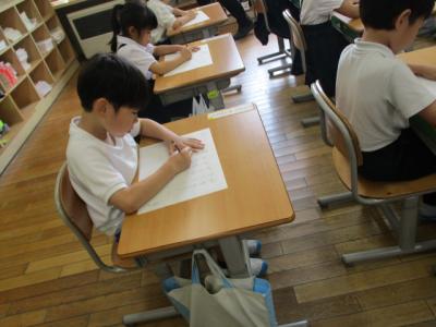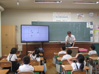 校長先生に硬筆指導をしていただきました! 全てのひらがなの学習を終え、より形を整えて書いたり、 正しく覚えたりするための時期に入った1年生。「濃く、 ゆっくり、そっくり」に頑張って、一文字一文字丁寧に書いていました。とっても字がきれいになりました。