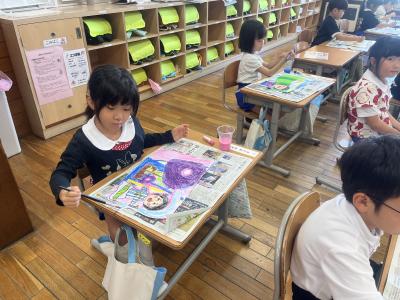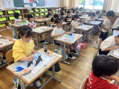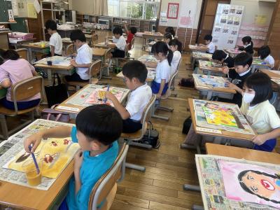 「夏休みにしたことやおもったことをえにかいておしえよう」 というめあてで、子どもたちは、 夏休みの思い出などを真剣な表情で絵に表していました。