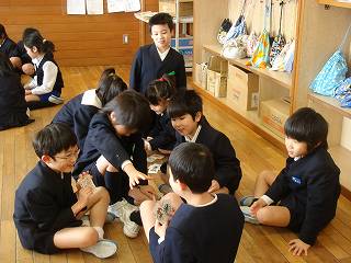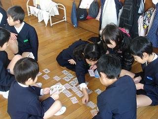 浅野川小による劇を見た後は、グループごとに、かるた、トランプ、あやとり、おりがみなどをして楽しく遊びました。