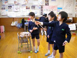 生活科では、「むかしからのあそびをたのしもう」という学習に入りました。けん玉やお手玉、こまや竹とんぼなど、昔遊びにチャレンジしました。授業では、上手な友達から教わったり、インターネットで新しい技を調べたりする姿が見られました。休み時間も積極的に練習して、どんどん昔遊びが上手になっています。