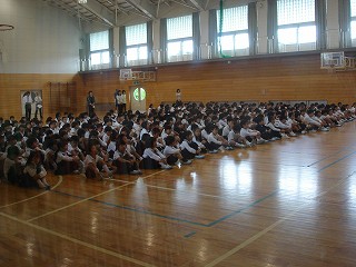 あいにくの雨のため、 朝のつどいは体育館で行いました。