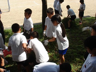 学年別に場所を分担し、ゴミ拾いと草集めをしました。