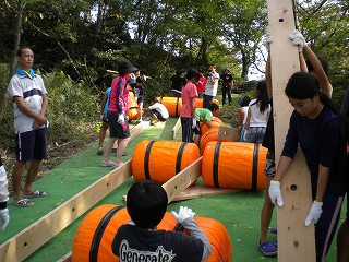 ひものしばり方は知恵をしぼって、汗をしぼって、みんなで力を合わせてようやく完成!