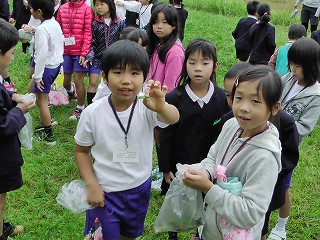 体育館での開会式の後、グループに分かれ、浅野川小学校の中や外を案内してもらいました。ぴょんぴょん広場ではバッタを探して大喜び。たくさん虫を捕まえることができました。その後、体育館へもどってドッチボール大会。午前中だけの交流でしたが、ぐっと仲良くなれました。お弁当の後、雨に降られてカッパを着ての帰り道でしたが、楽しかった交流会のせいか誰一人不平を言うことなく学校までもどりました。