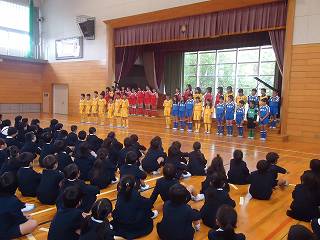 明日の本番をむかえるにあたり、今日の全校集会では壮行式が行われました。