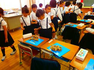 1年生の教室の様子です。図工の時間でねんどで「秋のもの」を作っていました。