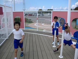 跳び箱を超えられるか、、のチャレンジはみんなが達成することができ、上手に跳び箱の上に飛び乗り、ジャンプして降りることができました。中には「見てみてー!!」と言い、高くジャンプをして着地している子どもたちがいました。