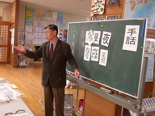 10月23日の3限目に、向粟崎にお住まいの耳の不自由な東さんをお招きして、「手話体験教室」を1組2組合同で行いました。