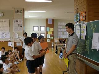 アメリカへ帰国されるアダムさん。朝の全校集会であいさつをいただきました。