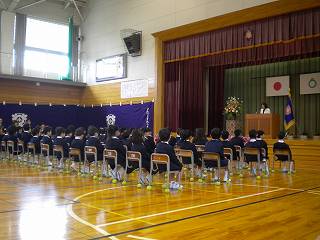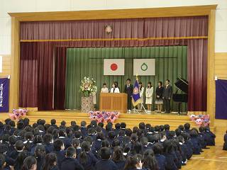 <入学式>今年の新入生は53人です。おにいさん・おねえさんたちが歌う校歌を振り向いて聞いていました。