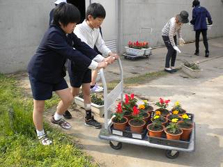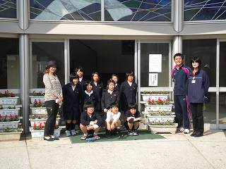プランターは児童玄関前に、鉢は校内に運んで完了。最後に記念撮影をしました。