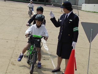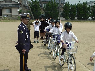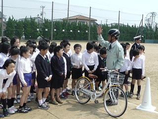 津幡警察署の人に来ていただいて交通安全教室を行いました。自転車の乗り方についての学習です。この安全教室の後、4年生から自転車に乗ってもOKとなります。