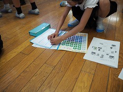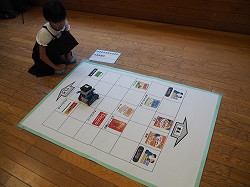 PFUから講師の方が来て下さり、シールプログラミングというものを使い自分で考えた情報をロボットに伝え、実際にロボットを動かすという活動を行いました。