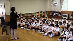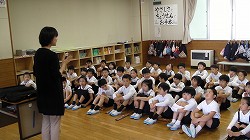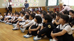 地震に続いて、津波から身を守る避難訓練を初めて実施しました。本校の校舎は海面から25メートルの高さにあります。避難訓練の計画段階では、何度もどのように避難するかを練り直しをして訓練日を迎えました。地震発生の緊急放送で、児童はいっせいに机の下にもぐって頭や体を守る体制になり、揺れがおさまるのを待ちました。その後、津波発生との放送で、全児童が校舎2階に避難しました。初めての経験でしたが、静かにすばやく避難することができました。訓練後は教室にもどり、放送とDVDで津波の恐ろしさと避難の仕方を学習しました。今日学習したことをおうちでも家族の皆さんに教えてくださいと伝えましたが、子どもたちは話したでしょうか。