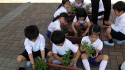 楽しい紙芝居の後、みんなでブルーサルビア・サルビア・マリーゴールドの苗を一人一つ植えました。一生懸命育てて、大きくきれいに育てていこうね。