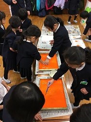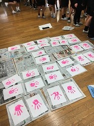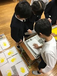 6年生を送る会に向けて、4年生が全校児童295人の手形を一人一人とりました。