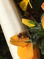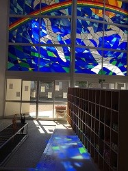ビオラの花には、ミツバチが蜜を吸いにやってきていました。児童玄関のステンドグラスも春の日差しを受けて、楽しそうに見えました。
