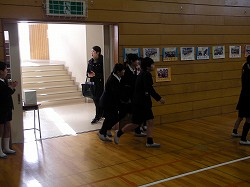 地震に続いて、津波から身を守る避難訓練を初めて実施しました。本校の校舎は海面から25メートルの高さにあります。避難訓練の計画段階では、何度もどのように避難するかを練り直しをして訓練日を迎えました。地震発生の緊急放送で、児童はいっせいに机の下にもぐって頭や体を守る体制になり、揺れがおさまるのを待ちました。その後、津波発生との放送で、全児童が校舎2階に避難しました。初めての経験でしたが、静かにすばやく避難することができました。訓練後は教室にもどり、放送とDVDで津波の恐ろしさと避難の仕方を学習しました。今日学習したことをおうちでも家族の皆さんに教えてくださいと伝えましたが、子どもたちは話したでしょうか。