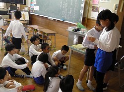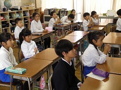 地震に続いて、津波から身を守る避難訓練を初めて実施しました。本校の校舎は海面から25メートルの高さにあります。避難訓練の計画段階では、何度もどのように避難するかを練り直しをして訓練日を迎えました。地震発生の緊急放送で、児童はいっせいに机の下にもぐって頭や体を守る体制になり、揺れがおさまるのを待ちました。その後、津波発生との放送で、全児童が校舎2階に避難しました。初めての経験でしたが、静かにすばやく避難することができました。訓練後は教室にもどり、放送とDVDで津波の恐ろしさと避難の仕方を学習しました。今日学習したことをおうちでも家族の皆さんに教えてくださいと伝えましたが、子どもたちは話したでしょうか。