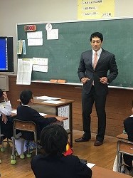 本日、5年生児童が「夢先生」の体験をしました。沖縄県出身の銘苅 淳さんが講師として指導してくだいました。銘苅さんは、ハンドボールの選手として海外のプロチームでも活躍された日本のトッププレイヤーです。子ども達は、プロの技を間近で見ながら自分達もミニゲームで楽しむことができました。体を思いっきり動かした後は、銘苅さんの楽しく、熱く、思いやりたっぷりの授業を受けました。キーワードは「笑顔で努力する」でした。