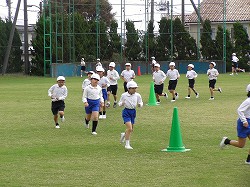 全児童が、長休み時間を使って芝生の運動場を走ります。