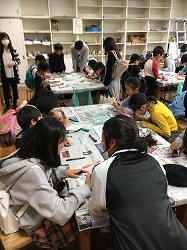 自分でデザインした紙に、骨組みをつけて、糸をつけて、凧が完成していきます。完成した凧は、さっそく運動場で飛ばしました。どの凧も、元気に走る5年生の後ろを、空高く飛んでいました。完成した凧は、5月の「世界凧の祭典」でもとばす予定です。日本海内灘砂丘凧の会の皆様、ありがとうございました。