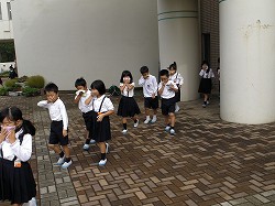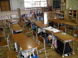 地震に続いて、津波から身を守る避難訓練を初めて実施しました。本校の校舎は海面から25メートルの高さにあります。避難訓練の計画段階では、何度もどのように避難するかを練り直しをして訓練日を迎えました。地震発生の緊急放送で、児童はいっせいに机の下にもぐって頭や体を守る体制になり、揺れがおさまるのを待ちました。その後、津波発生との放送で、全児童が校舎2階に避難しました。初めての経験でしたが、静かにすばやく避難することができました。訓練後は教室にもどり、放送とDVDで津波の恐ろしさと避難の仕方を学習しました。今日学習したことをおうちでも家族の皆さんに教えてくださいと伝えましたが、子どもたちは話したでしょうか。