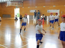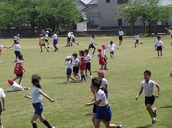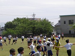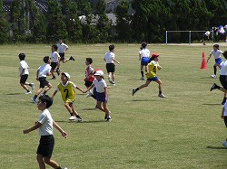 百人以上の児童が参加し、緑の芝生を思いっきり走り回っていました。楽しく体力向上を図れないかと、スポーツ委員のメンバーが自分たちで考えました。