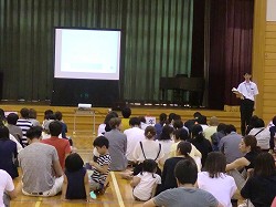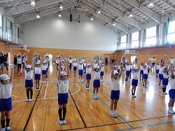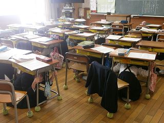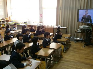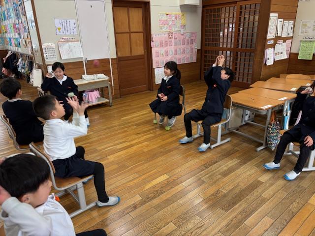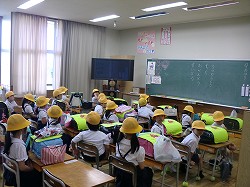 地震に続いて、津波から身を守る避難訓練を初めて実施しました。本校の校舎は海面から25メートルの高さにあります。避難訓練の計画段階では、何度もどのように避難するかを練り直しをして訓練日を迎えました。地震発生の緊急放送で、児童はいっせいに机の下にもぐって頭や体を守る体制になり、揺れがおさまるのを待ちました。その後、津波発生との放送で、全児童が校舎2階に避難しました。初めての経験でしたが、静かにすばやく避難することができました。訓練後は教室にもどり、放送とDVDで津波の恐ろしさと避難の仕方を学習しました。今日学習したことをおうちでも家族の皆さんに教えてくださいと伝えましたが、子どもたちは話したでしょうか。