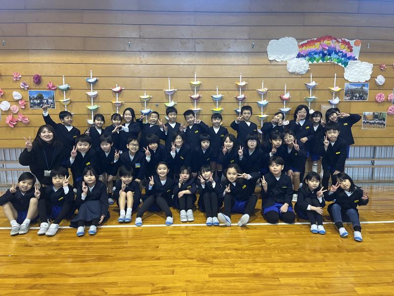 21日(金)に6年生を送る会が行われました。2年生の発表は、「 うれしなつかし!ダンスメモリー★」でした。ミニ劇の中で、 6年生が今までに楽しんできたダンスを披露しました。本番では、 6年生の反応を受けながら、2年生はとっても嬉しそうな様子で、 明るく元気よく踊ることができました。 最後の呼びかけもびしっと決めて、 本番後はやりきったという凜々しい表情をしていました。写真は、6年生へ心を込めてつくった鳥の飾りの前で撮りました!