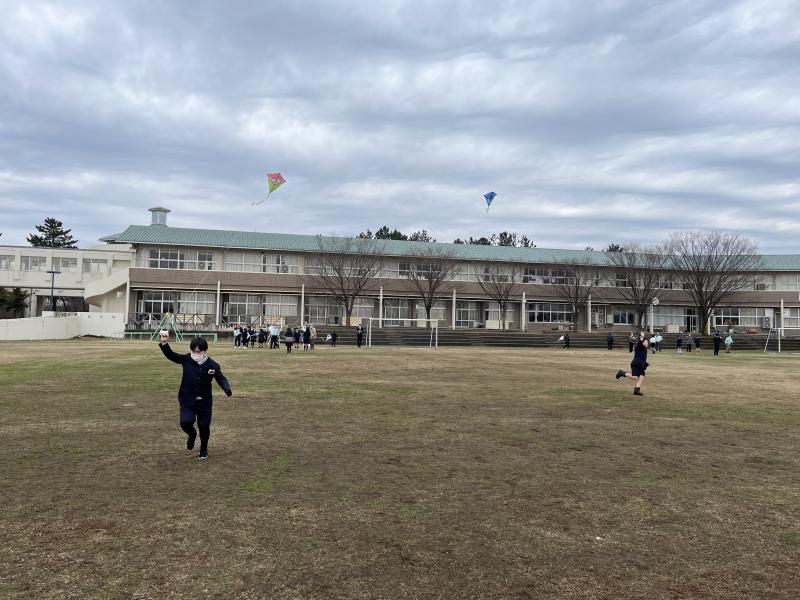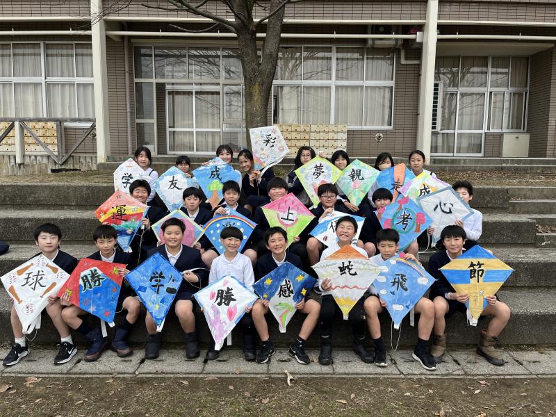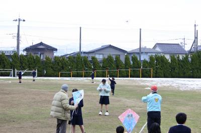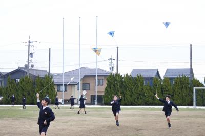 自分でデザインした紙に、骨組みをつけて、糸をつけて、凧が完成していきます。完成した凧は、さっそく運動場で飛ばしました。どの凧も、元気に走る5年生の後ろを、空高く飛んでいました。完成した凧は、5月の「世界凧の祭典」でもとばす予定です。日本海内灘砂丘凧の会の皆様、ありがとうございました。