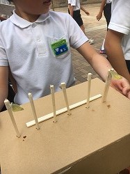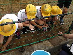 子ども達は、割りばしの先にとまってじっと羽をのばすモンシロチョウを見ながら、頑張れーと声をかけていました。