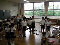 地震に続いて、津波から身を守る避難訓練を初めて実施しました。本校の校舎は海面から25メートルの高さにあります。避難訓練の計画段階では、何度もどのように避難するかを練り直しをして訓練日を迎えました。地震発生の緊急放送で、児童はいっせいに机の下にもぐって頭や体を守る体制になり、揺れがおさまるのを待ちました。その後、津波発生との放送で、全児童が校舎2階に避難しました。初めての経験でしたが、静かにすばやく避難することができました。訓練後は教室にもどり、放送とDVDで津波の恐ろしさと避難の仕方を学習しました。今日学習したことをおうちでも家族の皆さんに教えてくださいと伝えましたが、子どもたちは話したでしょうか。