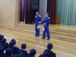 また、体育館では消防士さんから消火器の使い方やこれからの時期に気をつけることについて話を聴きました。